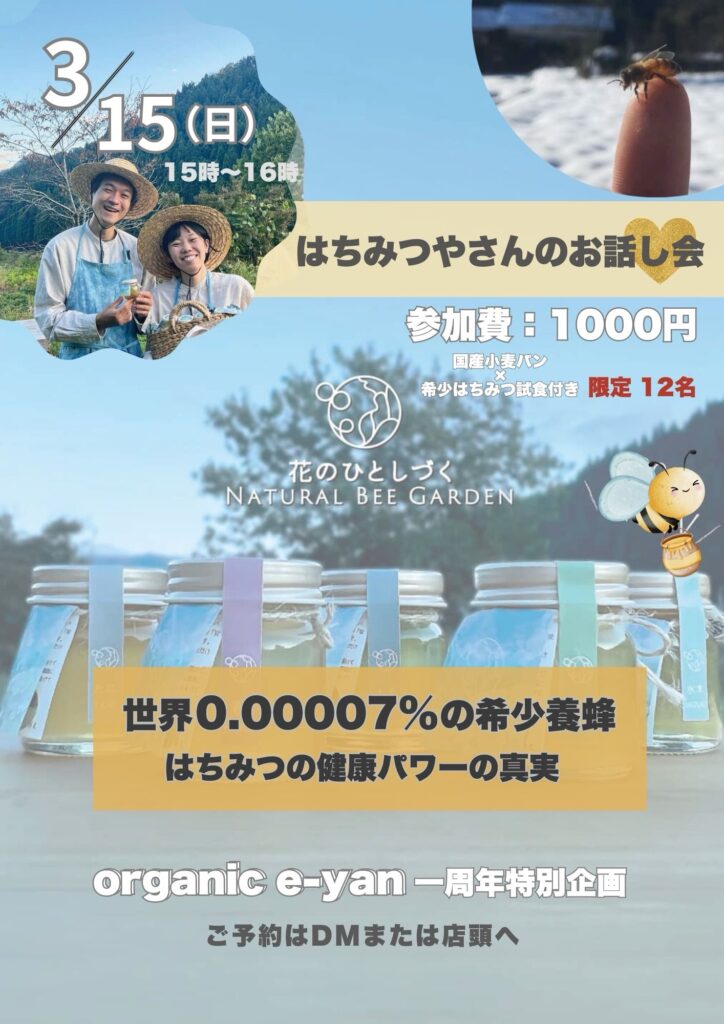 一周年記念として、無農薬米で作るお餅つきと特別企画《ハチミツ養蜂家のとっておきお話会&パンon試食会》をします✨